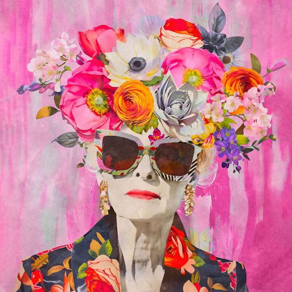 Questo ritratto d’impatto combina eleganza con una vivace esplosione di colore. Il volto è realizzato in gran parte in raffinate tonalità di grigio, facendo risaltare ancora di più la corona floreale dai toni vivaci. Grandi rose, ranuncoli e altri fiori nelle sfumature di rosa, arancione, giallo e bianco creano una composizione ricca, quasi teatrale. Lo sfondo rosa con delicate pennellate accentua il carattere artistico e dona all’insieme un aspetto moderno e creativo.