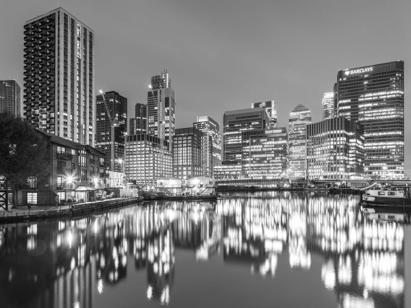 Londra di notte in bianco e nero. Nell'acqua si può vedere il riflesso degli edifici.