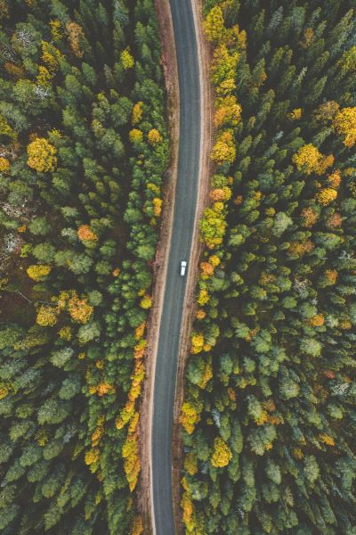 Vista dall'alto di una stretta strada attraverso un paesaggio di pini.