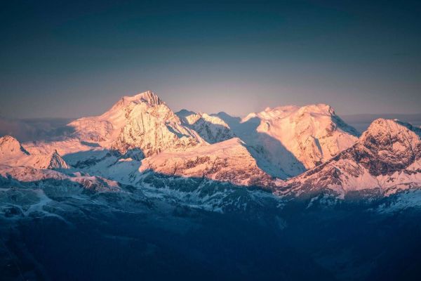 Un maestoso paesaggio montano è bagnato dalla luce rosa tenue del mattino. Le cime innevate catturano i primi raggi di sole, mentre le valli più basse sono ancora avvolte nell'ombra blu, creando un contrasto potente e una serena quiete.