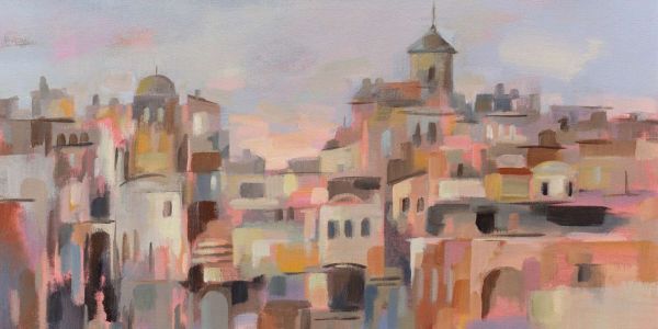 Una suggestiva impressione urbana nei toni caldi del rosa, dell'arancione e del viola, in cui cupole e torri si fondono in un insieme colorato e poetico sotto la luce soffusa della sera.