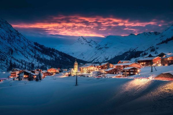 Un suggestivo villaggio di montagna avvolto nel silenzio invernale, illuminato da calde luci e da un incantevole bagliore rosa nel cielo serale. I chalet e le cime innevate insieme creano un pittoresco scenario invernale.