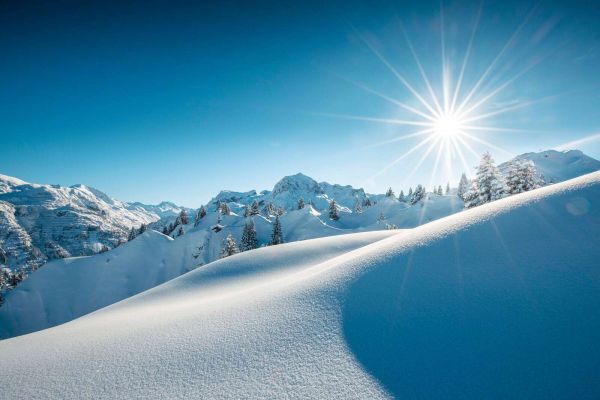 Raggi di sole cristallini illuminano dolci dune di neve in un paesaggio montano, circondato da abeti innevati e un cielo blu intenso. Un'immagine piena di pace, freschezza e luce.