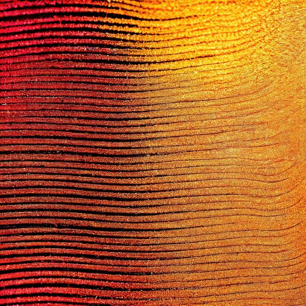 Un motivo astratto di linee ondulate nei toni infuocati del rosso, dell'arancione e dell'oro. La struttura ricorda la sabbia incandescente o la lava fusa e trasmette calore e movimento.