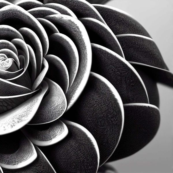 Una rosa stilizzata si dispiega in strati concentrici di nero profondo e bianco argento. Le linee pulite e la texture raffinata creano un effetto moderno e grafico con un'aura misteriosa, quasi ipnotica.