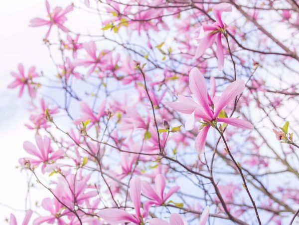 Magnolie fotografate dal basso durante una giornata di sole. Combinate questa carta da parati fotografica nella stanza per creare ancora più atmosfera.