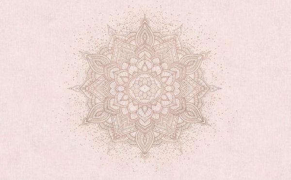 Un raffinato intreccio di linee di un mandala in tonalità sabbia morbide, incorniciato da sottili puntini che evocano un'atmosfera polverosa, quasi magica. I dettagli simmetrici creano un insieme rilassante e armonioso su uno sfondo rosa chiaro.