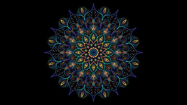 Un mandala colorato su uno sfondo nero. I colori allegri di questa carta da parati mandala creano un'atmosfera accogliente nella stanza.