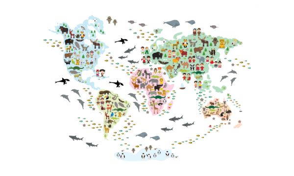 Mappa del mondo in diversi colori con animali diversi in ogni continente
