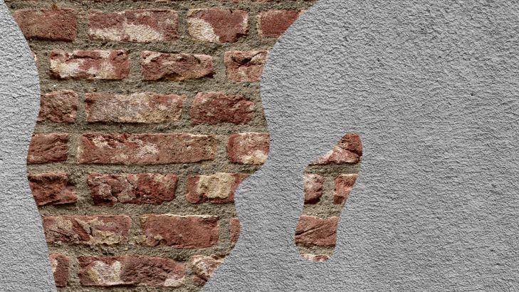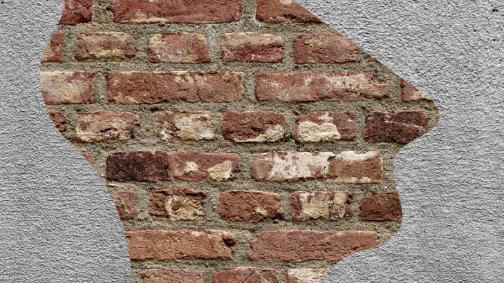 Mappa del mondo con mattoni su cemento. Lo sfondo grigio chiaro dà a questo design un aspetto industriale e porta la mappa in primo piano.