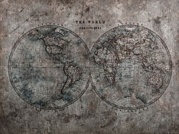 Mappa del mondo con sfumature di grigio su carta da parati fotografica. Le sfumature di grigio danno a questa carta da parati un aspetto industriale.