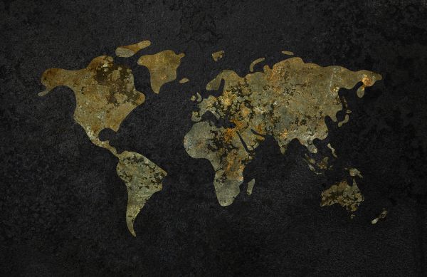 Mappa del mondo con struttura verde oro. Lo sfondo verde scuro fa risaltare benissimo la mappa del mondo di colore chiaro.
