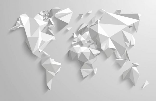Moderna carta da parati fotografica con una mappa del mondo in 3D con forme piegate. Questa resistente carta da parati dà una dimensione extra al tuo interno.