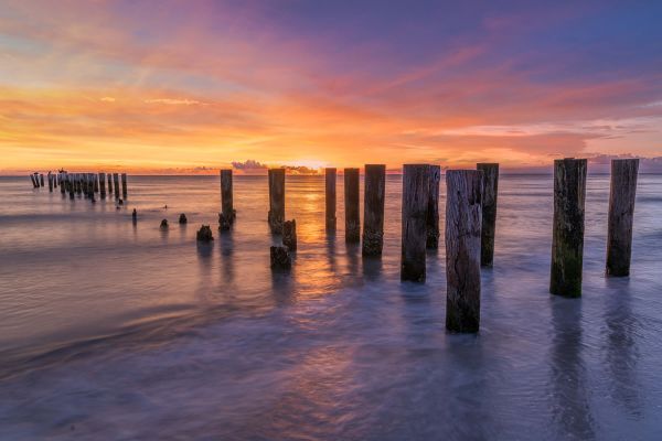 Una bella immagine di un mare viola arancione durante il tramonto con tavole trasparenti.