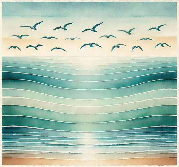 Leggere pennellate ad acquerello formano un mare calmo in strati di turchese e sabbia, con un volo di gabbiani che sorvola elegantemente l'orizzonte. L'immagine respira pace, spazio e libertà estiva.