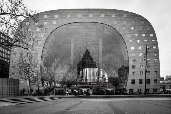 Questa impressionante immagine in bianco e nero cattura l'iconica Markthal di Rotterdam in un gioco di riflessione e simmetria. La enorme facciata di vetro riflette la città circostante, facendo sì che architettura e vita urbana si fondano senza soluzione di continuità. La struttura curva e slanciata dell'edificio forma un forte contrasto con le finestre rettangolari e la sottile riflessione di nuvole e luci cittadine.