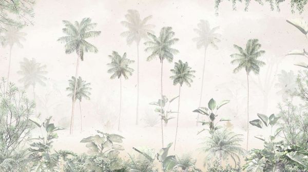 Una delicata palette di toni pastello verde e bianco dona a questa immagine di un paesaggio tropicale un aspetto sognante. La leggera nebbia che si attarda tra le palme rafforza l'atmosfera serena e intatta di questo rifugio pacifico.