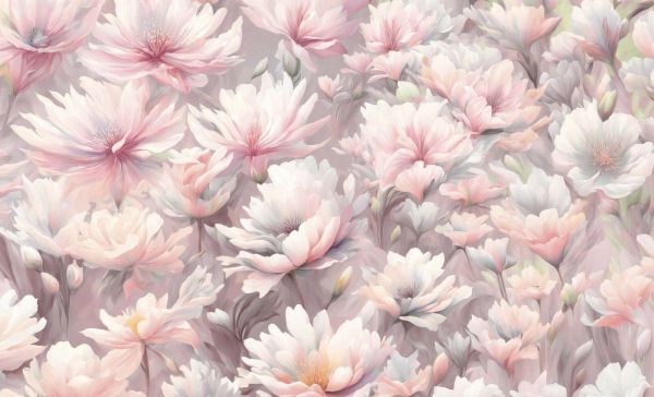 Un decor floreale romantico e raffinato con morbidi fiori pastello in tonalità di rosa pallido, crema e lilla chiaro. Le sottili pennellate e lo sfondo sognante creano un aspetto leggero, sereno ed elegante, perfetto per un interno rilassante.
