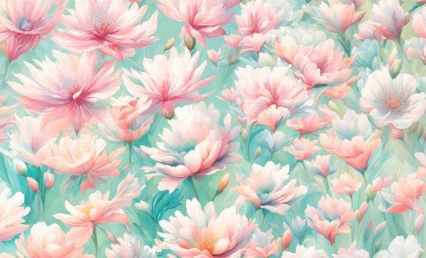 Un decor floreale sognante e leggero con delicati fiori dai colori pastello in morbidi toni di rosa, pesca e crema. Lo sfondo verde menta fresco conferisce un aspetto armonioso e luminoso, evocando una sensazione di freschezza ed eleganza estiva.