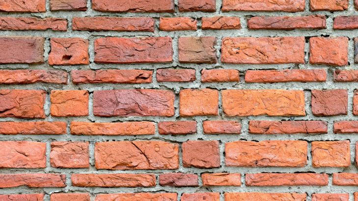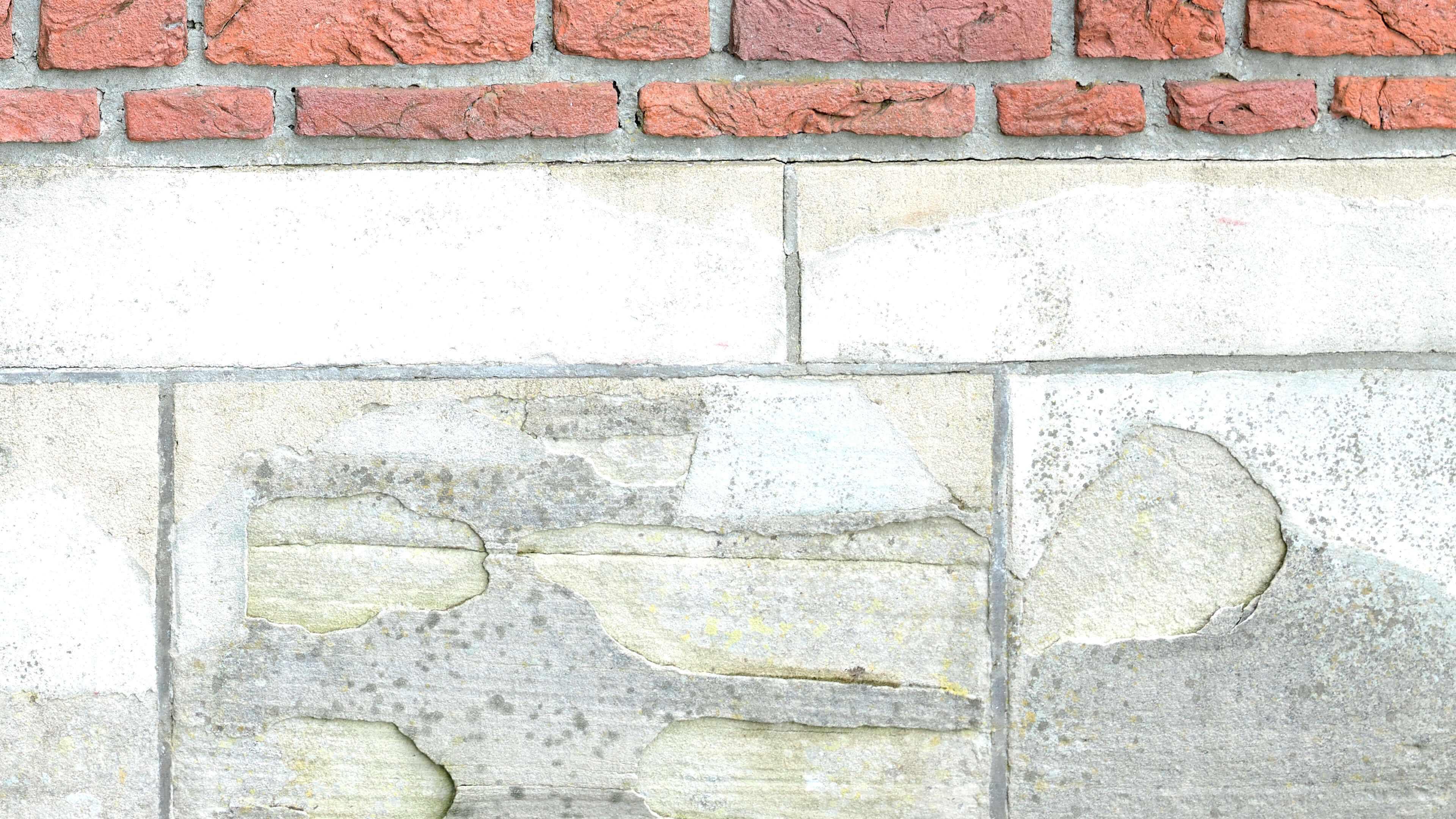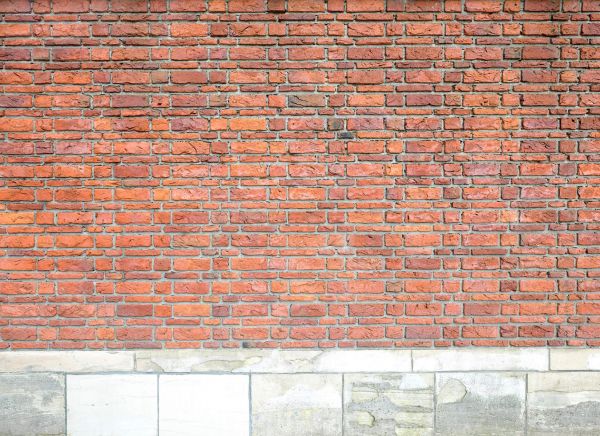 Un vecchio muro di mattoni rossi costruito su blocchi di cemento.