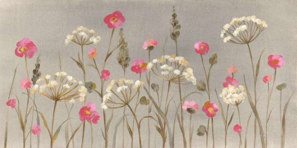 Una rappresentazione ariosa di un campo pieno di papaveri e fiori bianchi a ombrello su uno sfondo grigio caldo. I pennellate leggere e le tonalità naturali conferiscono un'atmosfera serena e campestre.