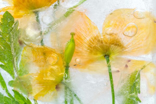 Fiori di meconopsis giallo su carta da parati foto. Le gocce d'acqua che accompagnano i fiori rendono questo sfondo fotografico ancora più realistico.