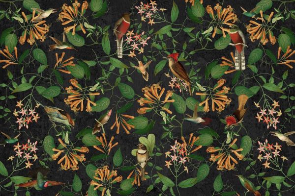 Una ricca composizione di colibrì tropicali e fiori colorati su uno sfondo profondo e scuro. Il fogliame verde e gli accenti dorati dei fiori creano un contrasto elegante ed esotico, perfetto per aggiungere un tocco di lusso a qualsiasi ambiente.