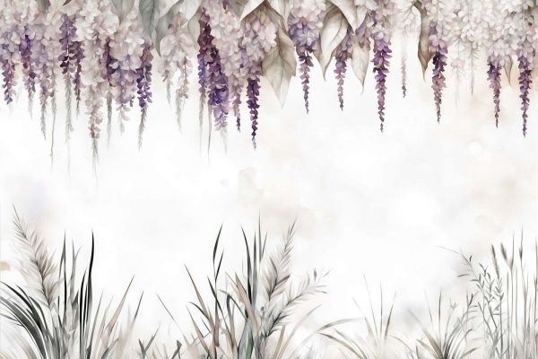 Un design elegante e sereno in cui i fiori di glicine pendono delicatamente verso il basso, incorniciati da morbide erbe selvatiche ondeggianti. Le tonalità neutre di beige, grigio e viola in stile acquerello creano un'atmosfera naturale e rilassante. Le delicate transizioni e la luce soffusa conferiscono a questo design un aspetto sognante e senza tempo.
