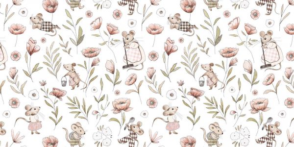Un motivo giocoso con topini allegri tra fiori e foglie, su uno sfondo bianco. I tenui colori pastello e le dolci illustrazioni creano un'atmosfera affascinante e vivace, perfetta per aggiungere un tocco carino e allegro a qualsiasi ambiente.
