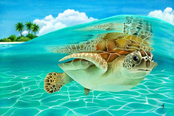 Una serena tartaruga marina nuota attraverso acque turchesi cristalline sotto un cielo splendente, con un'isola tropicale e palme ondeggianti sullo sfondo. La scena emana tranquillità e bellezza naturale.