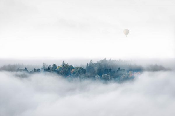 Una foresta coperta dalla nebbia. Una mongolfiera è visibile nel cielo.