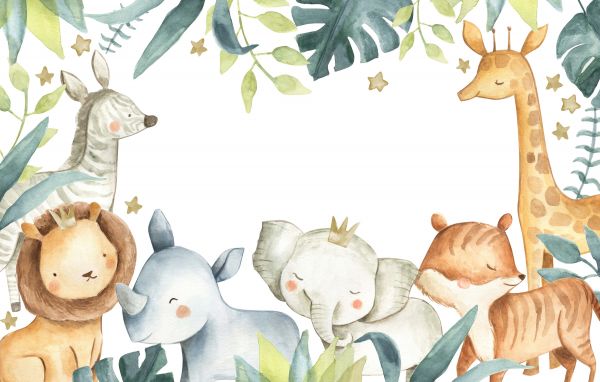 Un mix di animali nella giungla. Gli animali su questa carta da parati sembrano felici. La carta da parati fotografica perfetta per la stanza di un bambino.