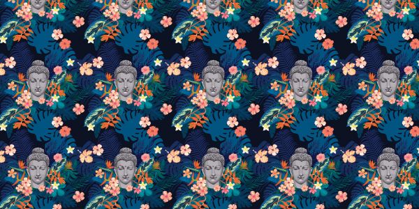 Un bel disegno di un Buddha con fiori e piume di pavone.