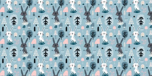 Un motivo blu con conigli. Questo modello nella stanza dà immediatamente più atmosfera.