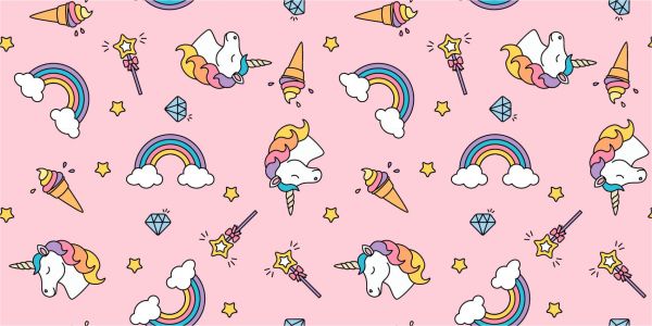 Carta da parati con un motivo di unicorni colorati, arcobaleni e gelati su sfondo rosa