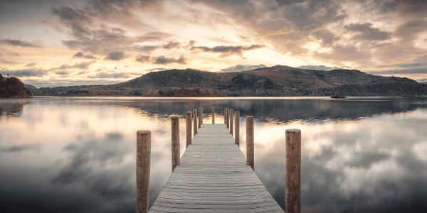 Un pontile di legno in riva a un lago con il tramonto e un riflesso nell'acqua