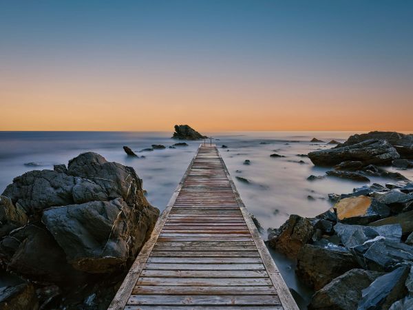 Molo sulla riva rocciosa durante un bellissimo tramonto. Con questo sfondo fotografico, è come stare sul molo.