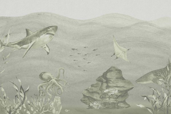 Una bella immagine con squali che nuotano, una razza e un polpo di colore verde.