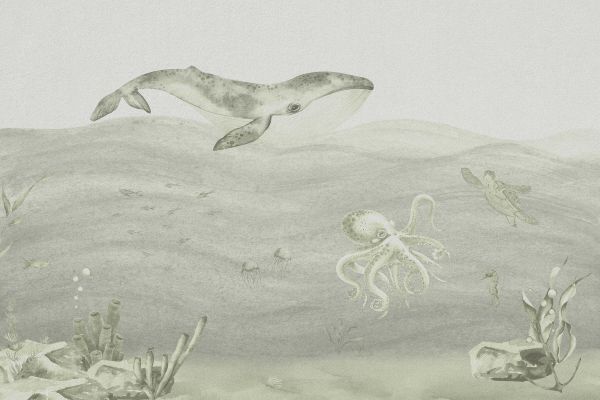 Un mondo sottomarino con una balena e un polpo di colore verde.