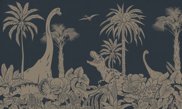 Un paesaggio preistorico con dettagliati dinosauri tra lussureggianti piante tropicali. Lo sfondo blu profondo esalta l'aspetto drammatico e vintage, mentre le silhouette dei dinosauri creano un contrasto dinamico.