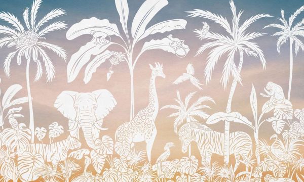 Un paesaggio esotico pieno di animali selvatici come elefanti, giraffe, zebre e scimmie, incorniciato da lussureggianti piante tropicali. Lo sfondo rosa tenue e le illustrazioni conferiscono al tutto un aspetto vintage e sereno.