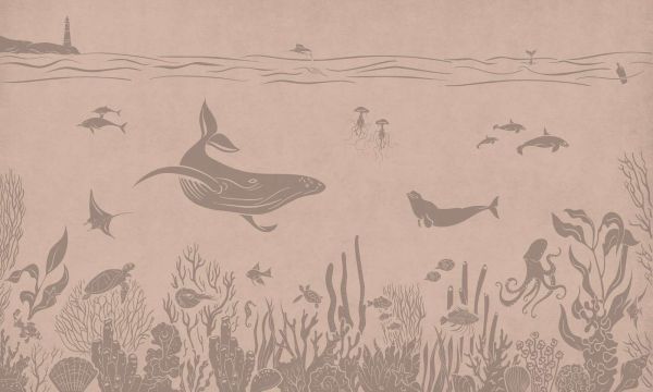 Un paesaggio sottomarino sereno con balene, razze e altri animali marini in tonalità tenui. Il design cattura la calma dell'oceano con dettagli minimalisti, coralli sottili e ombre che creano un'atmosfera raffinata.