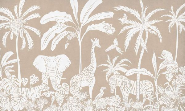 Un paesaggio esotico pieno di animali selvatici come elefanti, giraffe, zebre e scimmie, incorniciato da lussureggianti piante tropicali. Il colore morbido sullo sfondo e le illustrazioni conferiscono all'insieme un aspetto sereno.
