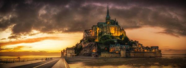Il Mont Saint Michel su carta da parati. Un'isola rocciosa, situata in Normandia, Francia. Il Mont Saint Michel è un patrimonio dell'umanità. Un cielo splendidamente illuminato con un'abbazia medievale illuminata.