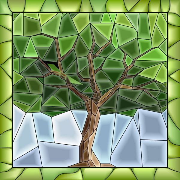 Mosaico di un albero su carta da parati foto. Il bordo verde intorno all'albero crea più profondità nella stanza.