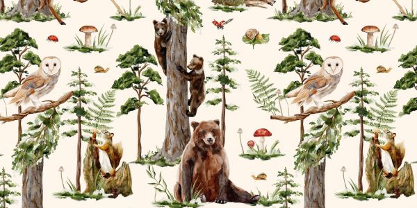 Un vivace mosaico di animali della foresta, catturati nel loro habitat naturale, arricchisce questo design. Da orsi curiosi a gufi vigili, ogni animale contribuisce alla storia della foresta, circondato da una vegetazione lussureggiante e elementi rustici, tessendo insieme un ricco arazzo di vita boschiva.