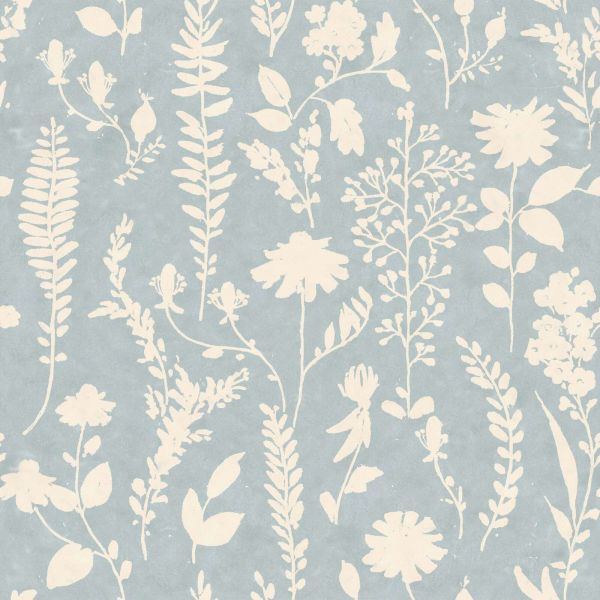 Elegante motivo di silhouette color crema di fiori di campo e foglie su uno sfondo blu-grigio tenue. Le forme raffinate conferiscono all'insieme un aspetto tranquillo ed elegante.