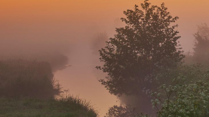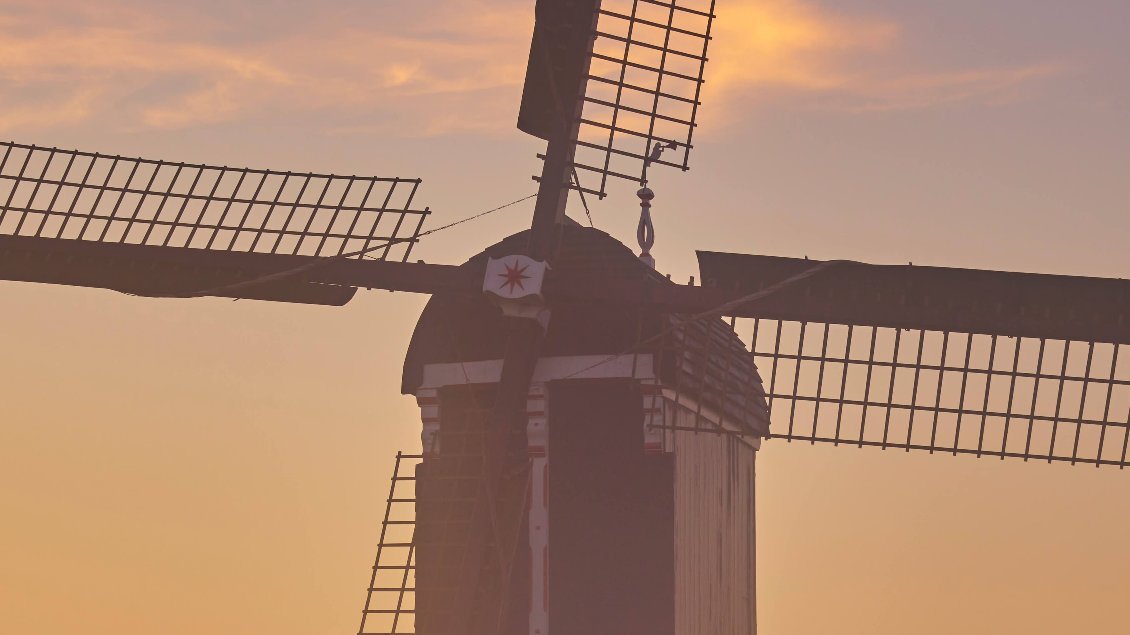 Mulino a un'alba colorata. L'alba ha colorato splendidamente il cielo con un bagliore arancione.
