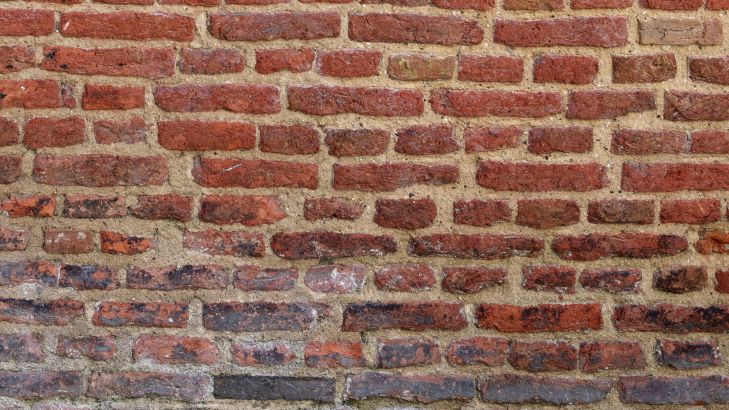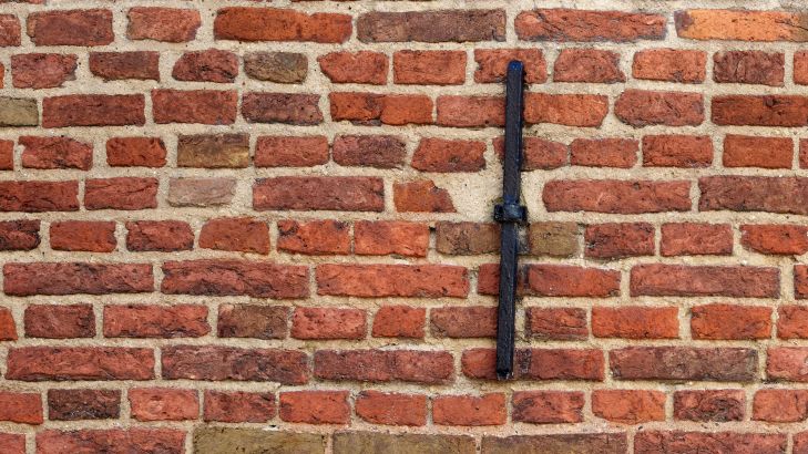 Muro storico rosso della città con tasselli in acciaio nero in diverse posizioni