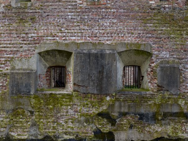 Muro di mattoni antichi con 2 nicchie. Sul vecchio muro il muschio sta già iniziando a crescere.